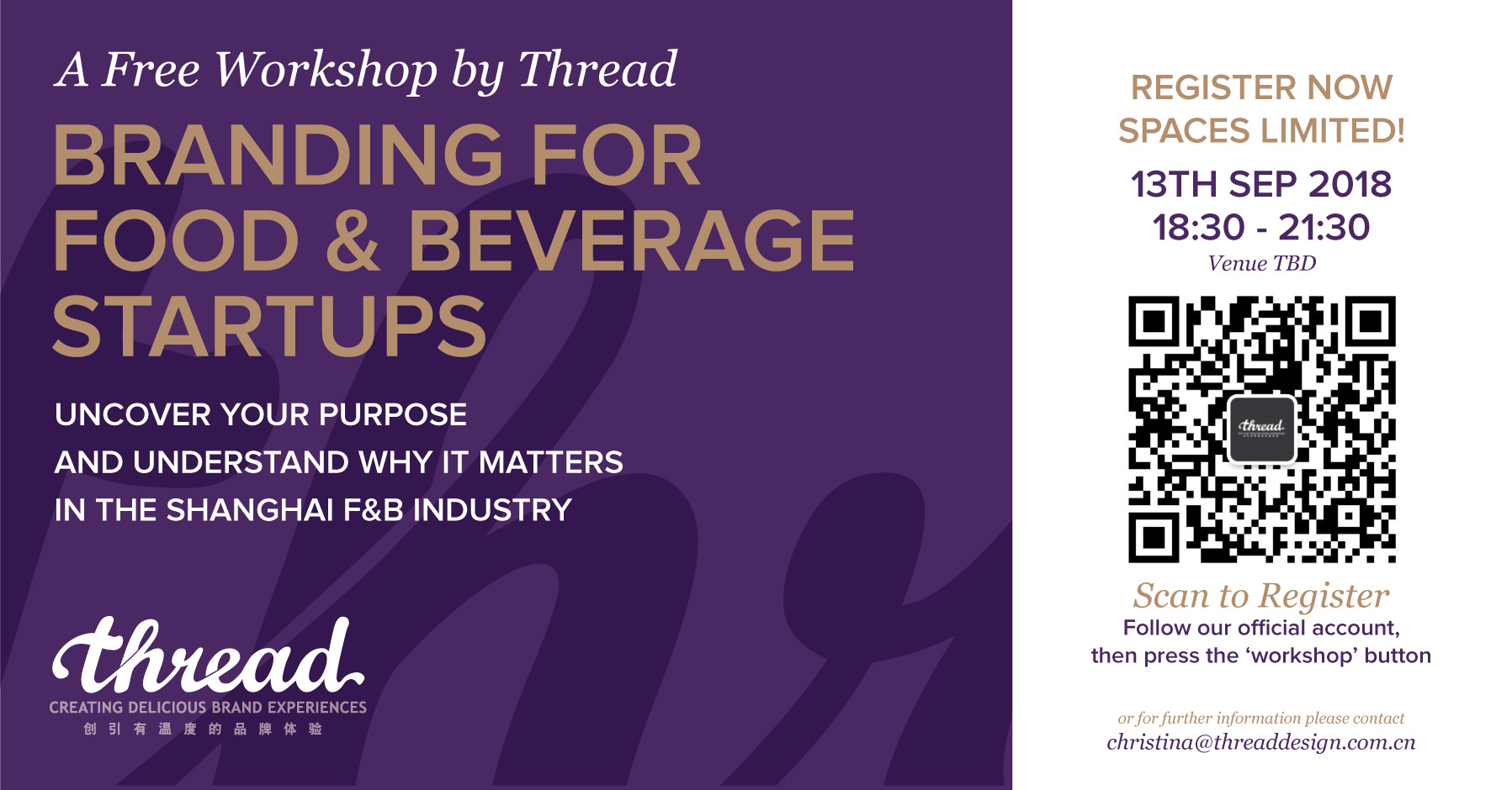 In Shanghai on September 13th, Thread is holding workshop to help F&B start ups uncover and formalize their purpose, if you would like to get involved scan the QR code below, or get in touch to see how Thread can help make your passion tangible.