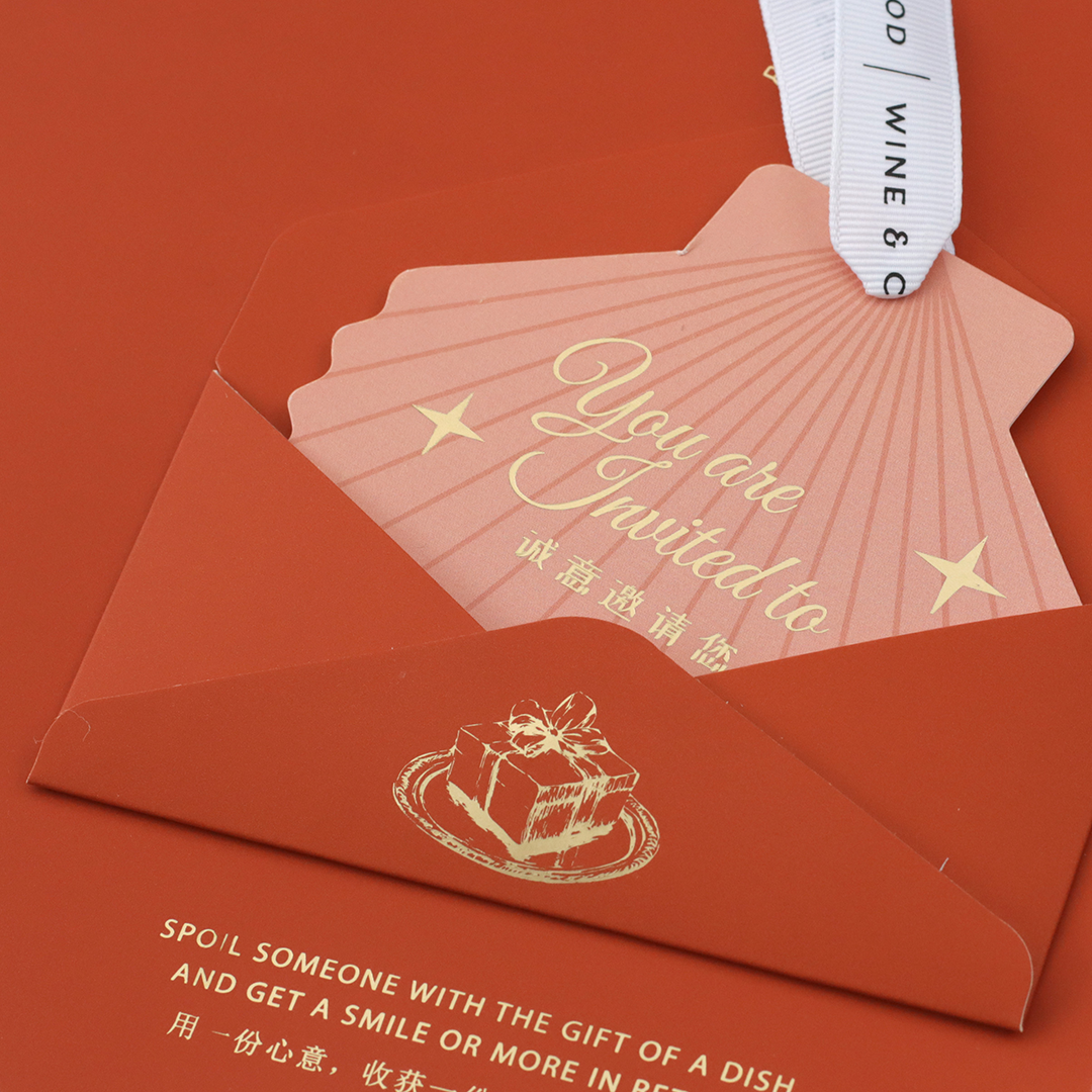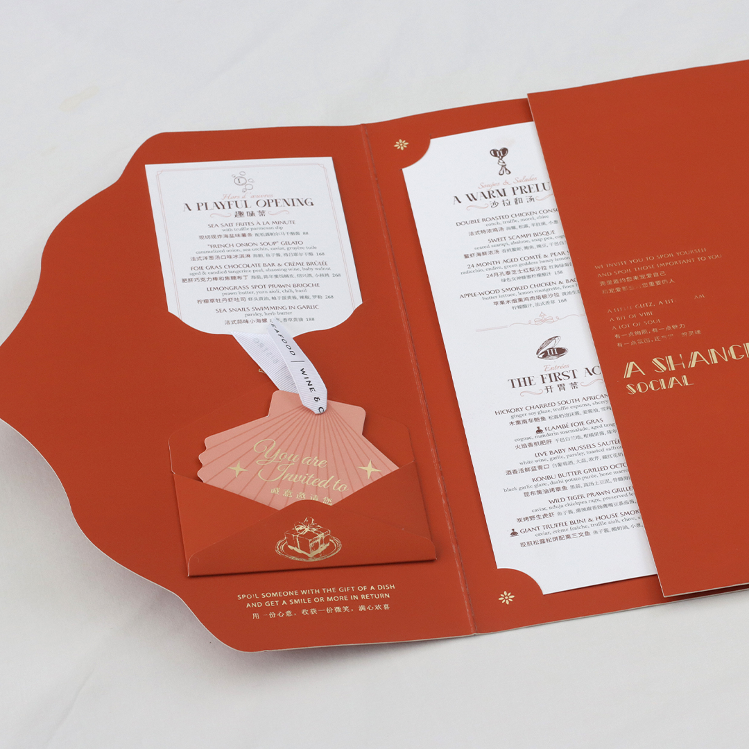 The carefully selected paper stock, combined with delicate gold foil elements, gives the menu a tactile richness, making it feel less like a menu and more like an invitation to an unforgettable dining experience.