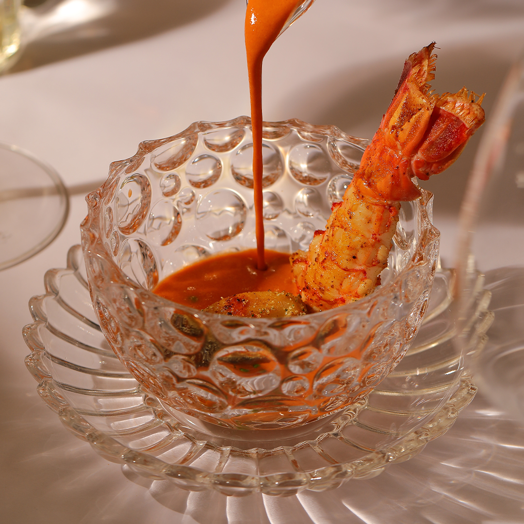 The color palette has been set to complement Coquille’s newly updated space—soft nude tones, vintage brass details, and the signature diamond-patterned glass accents – but also inspired to try some of the key dishes: live-pressed scampi with grilled lobster tail, anyone?