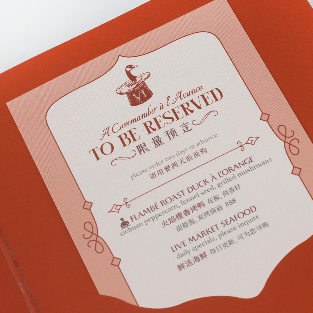 Coquille’s philosophy of blending fine dining with a sense of playfulness inspired our approach to the menu’s design. Instead of the traditional, formal French menu aesthetic (aka: white page, clean fonts), we opted for a refined yet more opulent approach that would go well with the restaurant’s refreshed interiors. The menu shall be presented an invitation… to indulge!